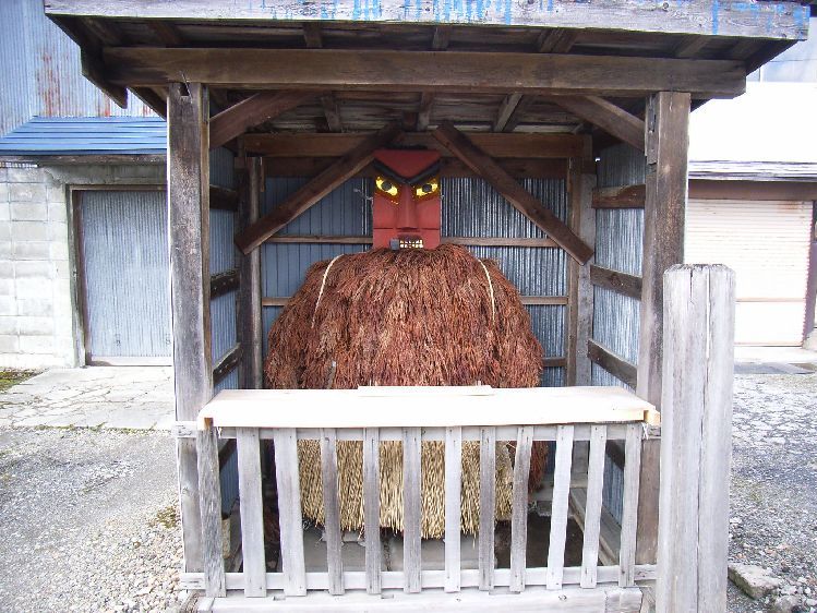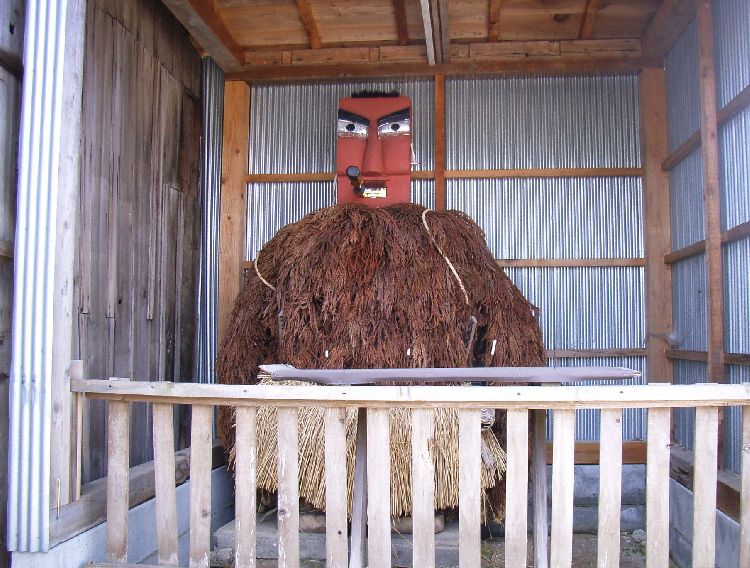 小掛・鍾馗様概要: 小掛集落では「鍾馗様」と呼ばれる人形道祖神の1つで、集落の入り口付近に男女別々に鎮座しています。当時は人形道祖神が集落へ入ってくる悪霊や疫病を防いでくれると信じられ、現在でも信仰の対象になっています。近くにある鶴形にも人形道祖神が存在するのですが、姿形や男女2体あることなどから大館市近郊にある人形道祖神に近いと思われます。朱色の木面は仁王像を連想させますが髪の毛や髭などがあり、 理由は分かりませんが男女とも煙管の様なものを咥えています。胴体部は秋田杉の産出地であるせいか杉の葉で覆われ、腰元には木製の刀が2本と弁当箱(横手市では納豆の包むようなものをぶら下げている人形道祖神もいました。)のようなものがぶら下がっています。下半身は隠れていますが男女どちらにも性器を模ったものも付いています。どちらも鶴形で見られる威圧的では無くユニークな感じをうけました。二ツ井町の民俗を知る上では大変貴重な存在で小掛の鍾馗様は能代市の無形文化財に指定されています。
