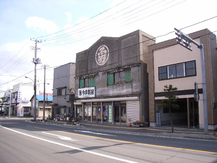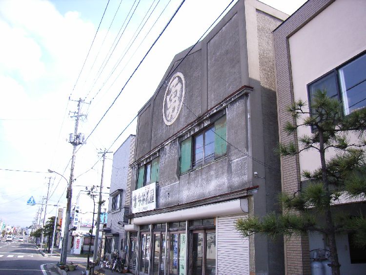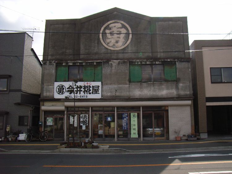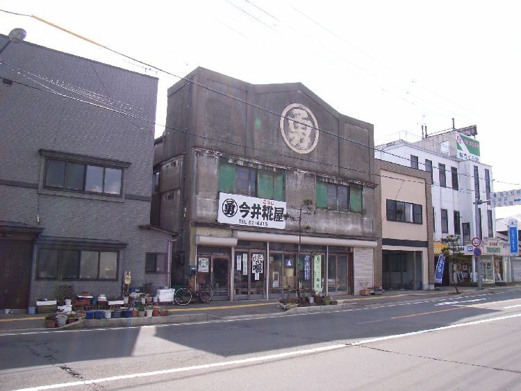| 今井麹屋概要: 今井麹屋は看板建築の一種で昭和初期の近代建築だと推察されます。木造モルタルの2階建てで建物前面全体が看板のようになっています。シンプルなデザインなのですが、かなりインパクトを与えるます。建物の形状と、それに描かれた店の名前が一体化しなんとも言えず印象深いです。昭和初期に能代市が火事になった後はこのような建物が多く建てられのではないでしょうか?能代市らしい建物の一角を占めています。