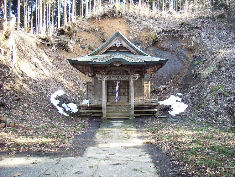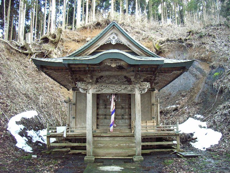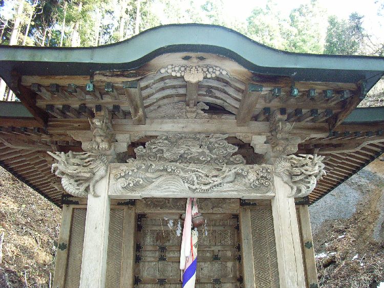 | 鶴形金毘羅宮概要: 鶴形金毘羅宮は案内板によると、祭神は大物主神です。鶴形は米代川舟運で栄えた町ということもあって、大漁や海上守護を目的として香川県にある金毘羅宮本山より霊札を拝領して御神体としたそうです。現在の社殿は文久3年(1863)に完成したものです。建築棟梁は鶴形の笠井喜右衛門、彫刻棟梁は能代の石山孫右衛門と書いてあります。現在でも建立者の小林家が代々守り続けています。社殿は小高い山の中腹にあり、そこに至る参道はかなり雰囲気があります。社殿も小規模ながら随所に凝った彫刻が施されかなり見ごたえのある建物だと言えます。