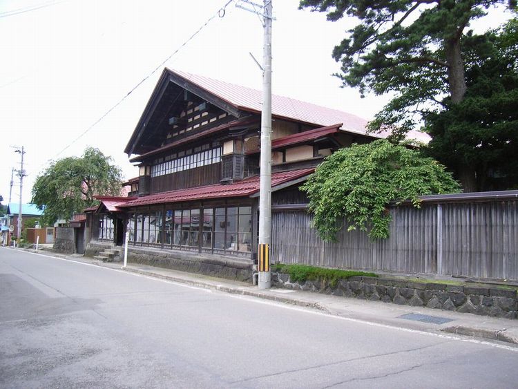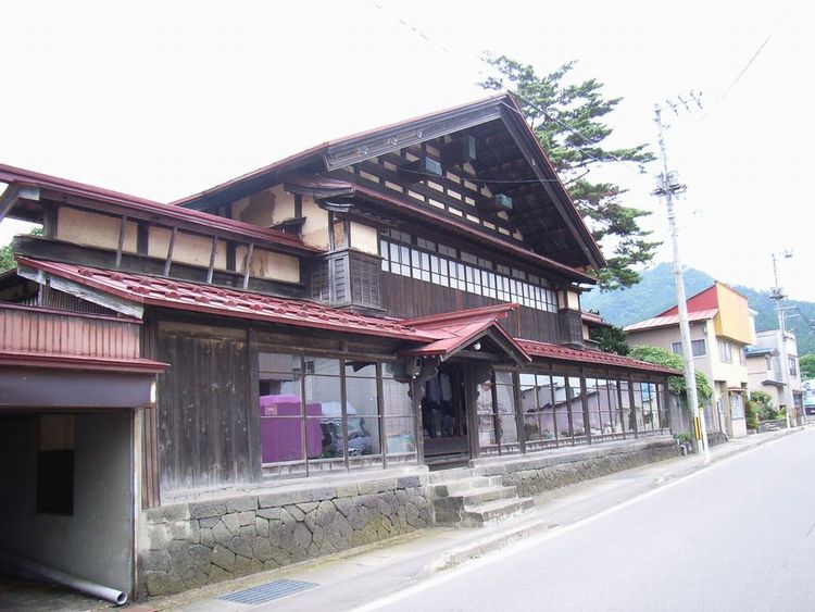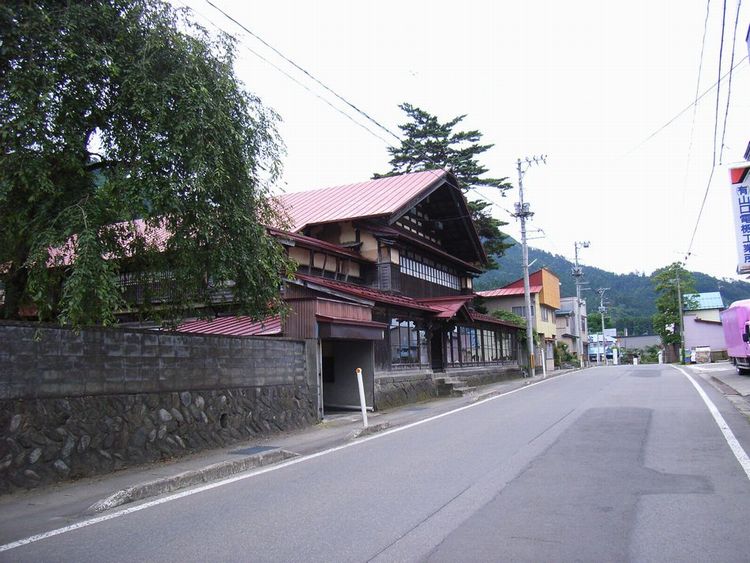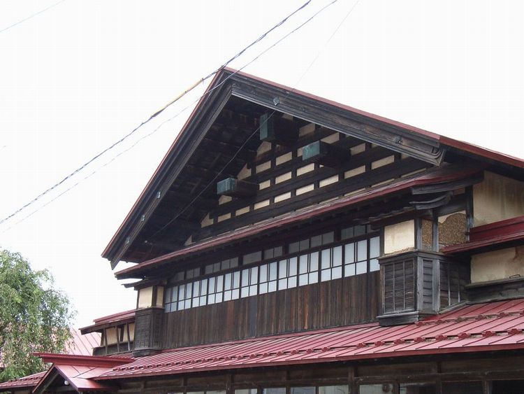 | 商家建築(町屋)概要: 阿仁銀山町の外れにある商家建築(町屋)です。特に文化財指定はないようです。時代的には明治時代だとは思うのですが、秋田県内でこれほどの町屋に出会うことは滅多にありません。まず大きさですが店部分だけで間口が11間あります。秋田の町屋に多い切り妻、妻入りで「うだつ」も道路に対して平行になっています。若干傾斜地に建っている為、店には玄関部分からしか入れないのですが、道路側が土間になっていて「こみせ」のようになっています。又、店の部分が現在でも床が張られていて、当時とまったく同じ様な店舗形態で経営しているのは今まで見たことがありません。外観は妻側の構造体が表しになっていて、力強さを出すと同時に水平線を強調することで、とても洗練した感じを受けます。