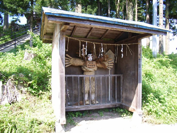 人形道祖神概要: 大館市近郊には様々な人形道祖神が存在します。人形道祖神とは一般的に藁などで作った人形のことで、集落境に鎮座し内部に悪霊や疫病などが入り込まれないようにする為の魔除けのようなものです。道祖神などと同じ様な意味合いを持つためこの様に呼ぶようになったものと思われます。同じ大館市ではありますが、その形状や配置など集落ごとに異なるといってよいほどです。大きく分類すると3つほどに分けられます。右側の写真は山田集落にあるもので、男神と女神は並んで集落境に立っています。男神は右側に立ち顔が赤く塗られ、男根がかなり強調されています。対して女神は左に立ち、顔が白に塗られています。胸が大きく妊娠しているようにお腹が出ています。これらは道祖神の由来の1つが大きく強調されたもので一種の性神としての要素が含まれています。単なる悪霊を入られないだけでなく子孫繁栄や五穀豊穣の願いが込められています。ジンジョ(地蔵)様と呼ばれ秋口にはジンジョ祭りが行われます。真ん中の写真は松原の山神社の境内にあります。ここから花岡町にかけては神社に鎮座する例が多くなります。一般的に道祖神は集落境に鎮座するものですが、当時は神社と寺院が混然としていた場合が多く神社に仁王様があることは不思議ではありませんでした(※現在でもそのような形態を取っている神社もあります。秋田神社山門参照)。県南では人形道祖神のことを仁王や草仁王などと呼ぶ地域もあることから、ここでは意味として混在しているのかも知れません。一番左の写真は人型に加工された板状のものを赤く塗っている形態をとっています。主に雪沢集落周辺で多く見られます。大館市内では小型の部類で男神女神ともに赤色に塗られています。今ここで挙げた3つの例はあくまで大枠のことであり、細かく見るとかなり複雑に分けることが出来ます。粕田集落では男神と女神は別れて集落境に鎮座していますし、二井山集落では姿形は山田集落に似ていますが神社の境内に鎮座しています。このように大きくは分けられても、その集落の歴史や交流、民族的解釈が異なることで同じ大館市という限られた地域の中でも様々な形態が発生したと考えられます。