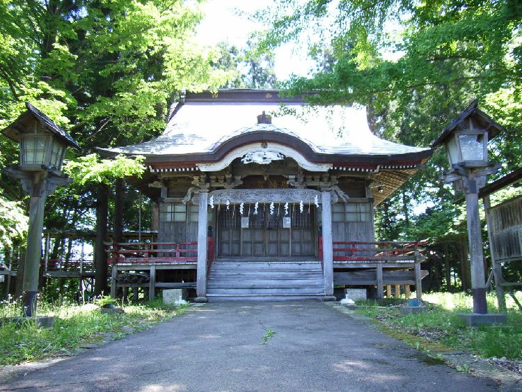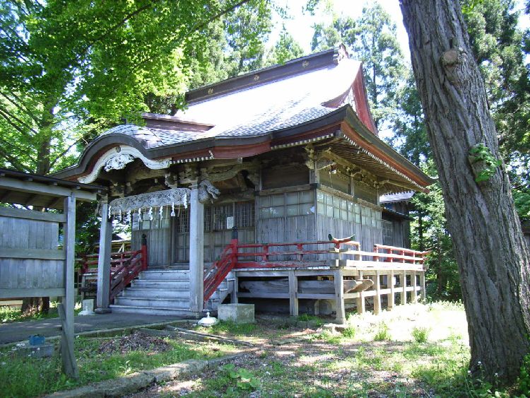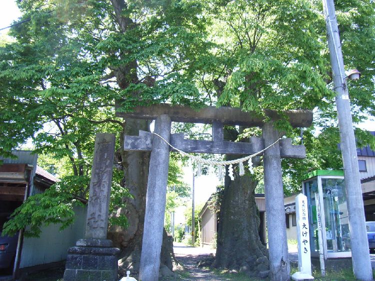 | 鷹巣神社概要: 鷹巣神社の創建は「白鷹伝説」に由来します。村はずれにあった大ケヤキに一組の鷹の夫婦が居ましたが、ある日雄の鷹が別の荒鷹に殺されます。残った雌鷹が巣を造り白い鷹を生みその子が父の敵を討ったということから、肝煎の斎藤伊勢が大ケヤキの麓に八幡神社を建立しました。鷹巣の地名もこの逸話からとられたそうです。明治になって愛宕堂と伊勢堂を合祀し、鷹巣神社と改名しました。例祭は7月末でみこしが市街地を巡行した後鷹巣神社に奉納されます。鳥居前にある大ケヤキは天然記念物となっています。