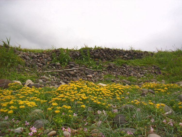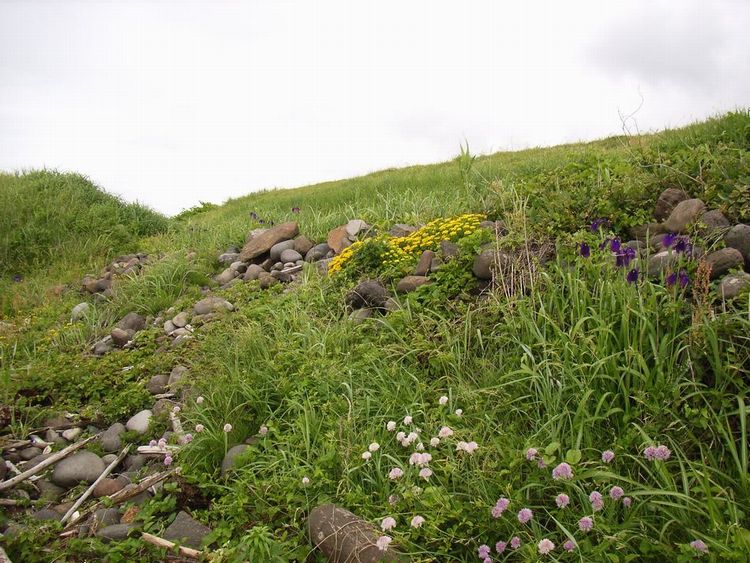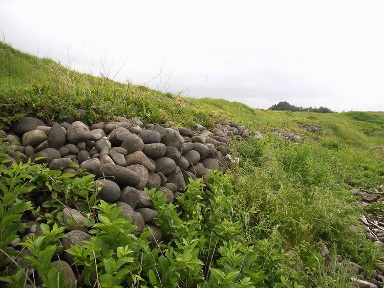 | 波除石垣(万石堤)概要: 波除石垣は別名「万石堤」と呼ばれ芹田地区(仁賀保)から飛地区(金浦)までの高さ1.2m〜2.7m程度の石垣です。羽州浜街道は海岸沿いにあった為、高波や強風から守る為に造られました。自然石を積み上げているだけですが延々と続く石垣には当時の街道への想いが伝わってくるようです。1782年に修復した記録があるそうなので、はっきりとしたことは解りませんが、羽州浜街道が整備されてからなんらかの工夫がなされていたのかも知れません。波除石垣は全国的に見ても類例がない貴重な文化遺産で、国指定史跡に指定されています。又、「未来に残したい漁業漁村の歴史文化財産百選」にも選定されました。これは仕方の無いことなのでしょうが、テトラポットが石垣と平行していて景観的には少し悲しい感じはします。