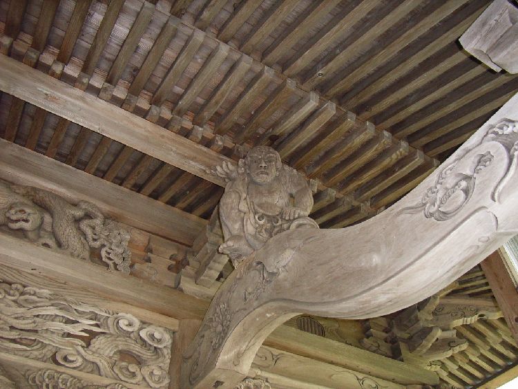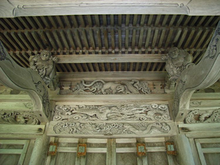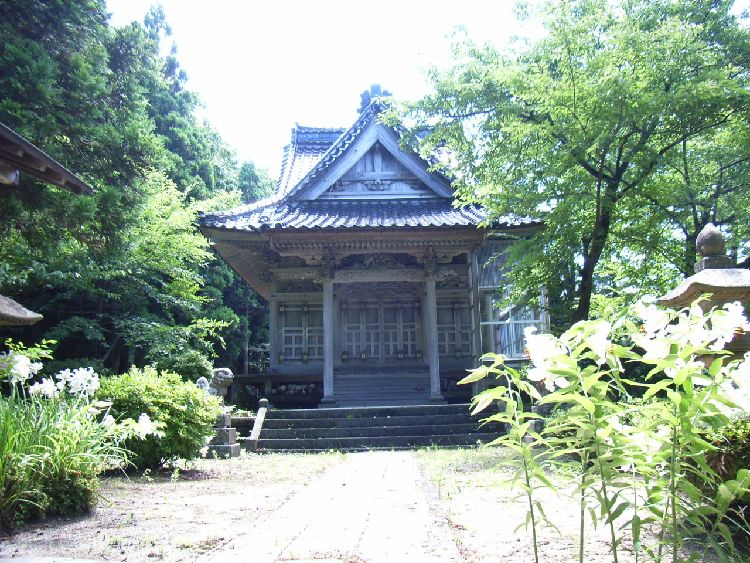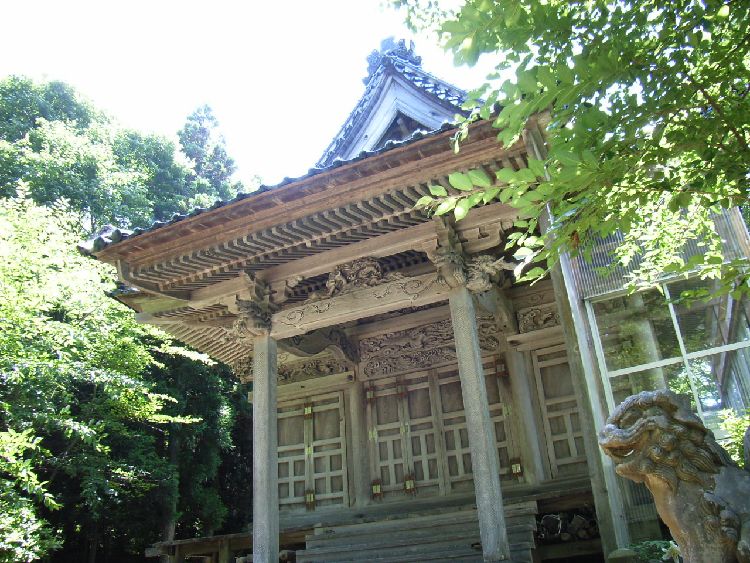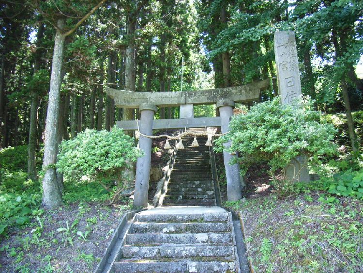 | 日住白山神社概要: 日住白山神社は由利本荘市の郊外にある鮎瀬石橋山に鎮座し、創建は嘉祥3年(850)と言われています。当初の祭神は伊邪那岐命、伊邪那美命、菊理姫命で白山妙理大権現と称し、当地の支配者に崇敬され、江戸時代に入ると本荘藩六郷家の祈願所となり、数々の寄進を受けています。享保16年(1731)に石橋山に遷座し、文政10年、慶応2年にそれぞれ社殿を再建しています。明治に入り神仏分離令の際、白山神社としますが、同42年に日住山に鎮座していた日住神社と合祀した為、日住白山神社と社号を改称しています(古四王神社、宮比神社、大日霊神社も合祀)。日住神社は寛永元年(1624)より本荘藩一ノ宮だったので現在の鳥居の前には「本荘藩一ノ宮」を示す石柱が建てられています。その後、昭和29年に日住神社は再び日住山山頂付近に再建され分祀しているようですが瀬織津姫神はそのまま祭られています。社殿は小規模ながら、六郷家の祈願所らしく彫刻など凝った造りで力士像など配しています。