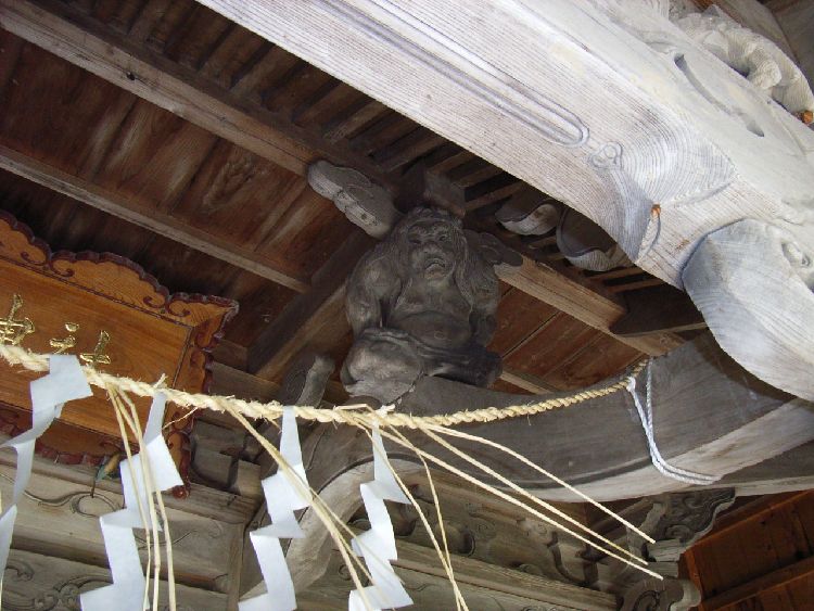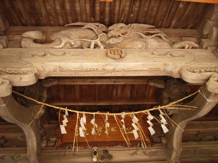| 諏訪神社概要: 諏訪神社は由利本荘市郊外にある万願寺に鎮座しています。秋田県神社総監によると祭神は武御名方命で例祭は4月15日に行われています。創建は宝歴三年(1753)で安永八年(1779)に再建し、嘉永7年(1854)に改築しています。由利本荘市にある数少ない近世の神社建築として大変貴重な文化財と言えます。現在は社殿の外側に覆いをしている為直接は見られませんが、かなり凝った彫刻などが見られます。特に蝦虹梁には2体の力士像が鎮座し、周辺の神社建築と特徴を良く現しています。本荘藩主六郷氏は配置替えの前の領地六郷にある諏訪神社の崇敬が厚かった為か、当社でも何らかな係わりがあったようで、社殿正面に施されている神紋は六郷氏と同様「三つ亀甲の内七曜」となっています。