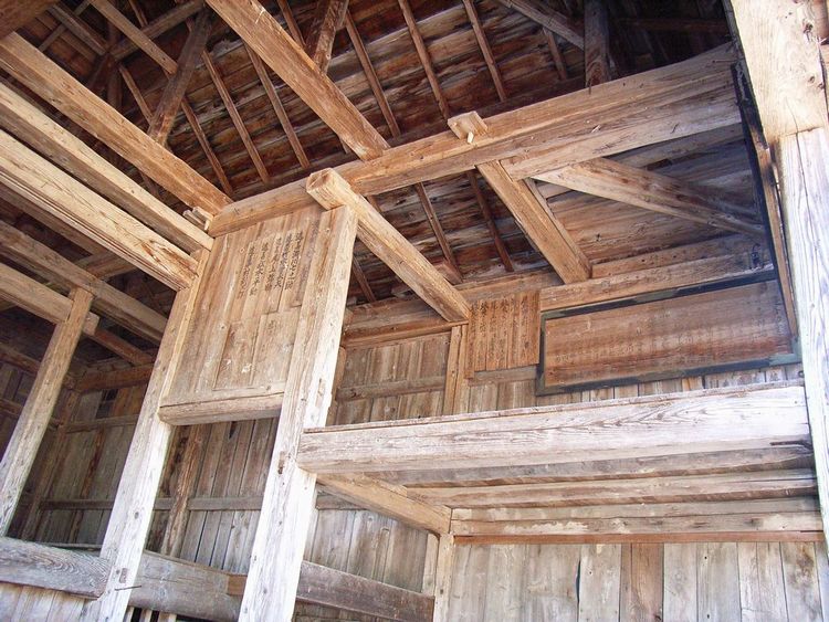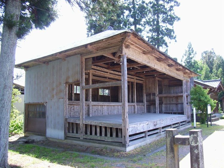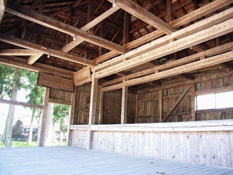 | 神楽殿(芝居小屋)概要: 日枝神社神楽殿は本殿よりも有名で旧由利町の町指定有形文化財になっています。神楽殿は「芝居小屋」とも呼ばれ、嘉永7年〈1854年〉に建立された歌舞伎の芝居小屋で秋田県内ではここ前郷しかない貴重な建物です。現在でも「大日神楽」や「獅子こ踊り」の他にも、多くの芸能が披露されていて前郷にとって生きた文化財と言えます。舞台は手前の方に傾斜が掛かっていて遠くの人にも見えやすいよう工夫されています。向かって右側のやぐらが組んでいる場所の上段は浄瑠璃を語る「太夫ヤグラ」と呼ばれる所で、下段はお囃子をする「下座」と呼ばれるところです。舞台は2段になっていて、上段を良く見ると真ん中で仕切られるようになっています。後ろの方が役者の控えになっていたようです。この神楽殿を維持していくのは大変かとは思いますが、せめて外壁のトタンは直せたらもっとよくなるような気がします。