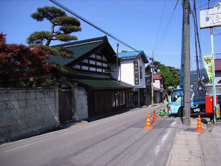 | 出羽の冨士醸造元概要: 出羽の冨士醸造元は明治40年に佐藤酒造店として創業しました。矢島にある「乳母坂」と呼ばれる坂の途中にあります。建物の形からその当時の姿を留めているようです。切妻、妻入りの建物で1階正面に下屋を出しているのは秋田県内にある町屋のスタイルと云えます。明治以降は建物は身分による高さ制限がなくなりますので軒が高くなる傾向があります。屋根は緑色の瓦が乗っていますが、創建当時のものかは分かりません。向かって右側の建物は後に増築したと見られます。様々な事情があるとは思いますが、多少違和感があります。「乳母坂」の通りは出羽の冨士醸造元を代表する町屋形式のものや、店蔵が平入りのもの、洋館など様々な形式の建物がありなかなか面白い通りになっています。