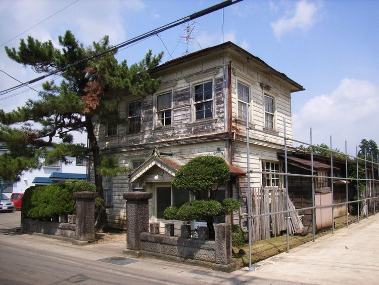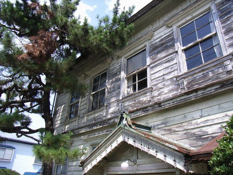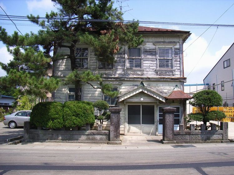 | 今野邸概要: 矢島町にある洋風建築(洋館)です。用途や建築年代は分かりません。近くにもう1棟あるのですが同じ様な形式を持っているようです。木造2階建ての建物で外壁は下見板張りで、縦長の窓を採用しています。窓回りにはさらに部材を使用し窓が立体的に見えるようにしています。2階の屋根と外壁のつなぎ目も何かデザインしています。玄関前ポーチに切妻の屋根が掛けられて、建物の本体の軒の出よりさらに深いものになっています。雪深い矢島ならではの実用を兼ねたデザインだと思います。又、玄関庇には洋風建築の特徴である軒先の飾り付き板のバージボードも施され、小さい建物ながら見ごたえがあります。