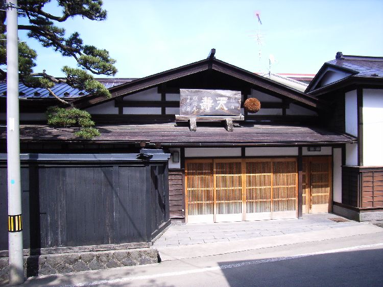 | 天寿酒造概要: 天寿酒造は旧矢島城下で矢島街道沿いにあります。改修された為か、向かって左側は多少違和感がありますが、全体的に落ち着いた雰囲気があり、山間の城下町に似合う建物になっています。玄関部分は切妻、妻入になっていて雪国秋田によく見かける町屋形式です。間口が広い為か「こみせ」などは無く、秋田市の新屋の町屋でも見られるように前面に坪庭がある構成になっています。