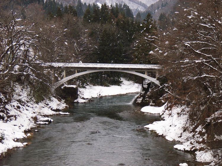 | 田子内橋概要: 田子内橋は、径間長33m,RC造,開腹式の単アーチの道路橋です。昭和10年に竣工して平成16年に登録有形文化財に指定されています。アーチ式のせいなのか、周囲の自然と人口の構造物とが不思議と溶け込んでいます。どちらが優先といことでも無くお互いが引き立てあっているようにも感じます。最近の単純なコンクリートの建物と比べても格段の差があるのではないでしょうか。東成瀬村にある数少ない有形文化財なので後世まで伝えていってほしいものです。