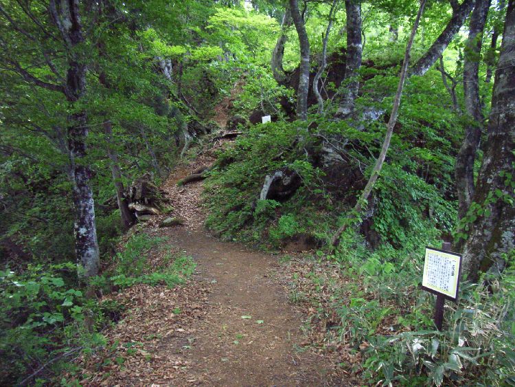 | 一夜盛概要: 案内板によると「昔、この周辺は、東側(山の上に向かって右側)が亀田藩の領地になっていて、峰を境に領地が分けられていました。領地を広げようとした佐竹藩が、峰と峰の間に土を盛り、一晩で峰続きにしたという謂れからこの場所に「一夜盛」の名が付けられました。」とあります。実際、人工的に峰続きにしたのかは解りませんが自然にしては不自然なところです。保呂羽山周辺は秋田藩(佐竹藩)と亀田藩の藩境があり何度も境界争いがあるのは事実で、下の駐車場付近には境塚が築かれようやく境界争いが解決したそうです。この一夜盛もそのような事実と交じり合った逸話のような気がします。