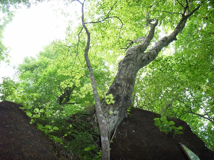 | 岩割りの木概要: 案内板によると「偶然、岩のくぼみに落ちた小さな種は、わずかな割れ目に根を伸ばしました。やがて種は苗となり岩を割って成長を続けました。そして何百年もの後、小さな種は立派なブナの大木になりました。もともと2本ありましたが、平成12年の大雪で折れてしまいました。」とあります。保呂羽山は確かに様々な場所からその頂が望める霊山としての存在感はありますが、このような名勝や奇岩なども多いことも保呂羽山が信仰の対象になっている1つの要因と思います。お伊勢参りとまではいきませんが、身近な娯楽の1つとしても保呂羽山参りがあったように思います。