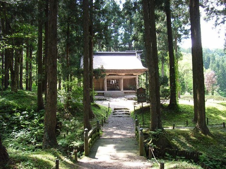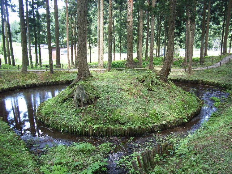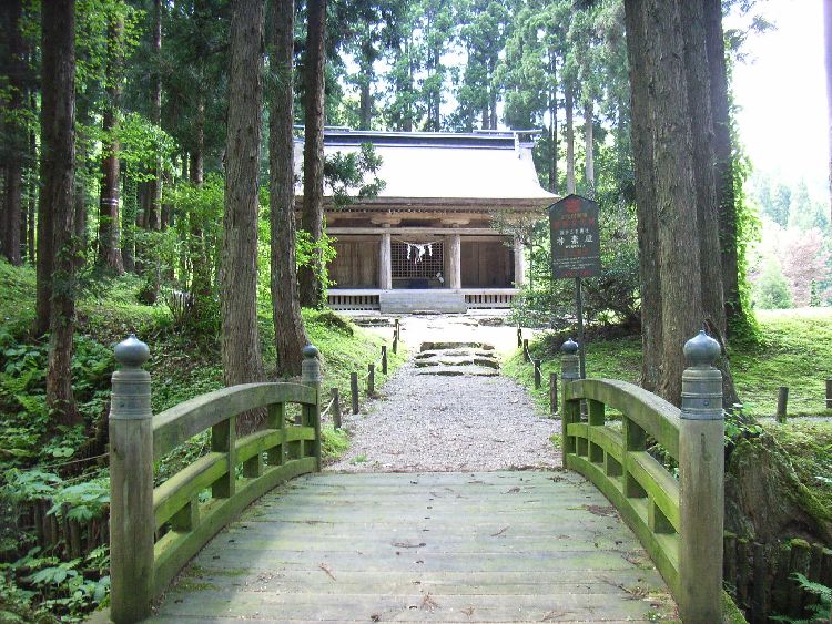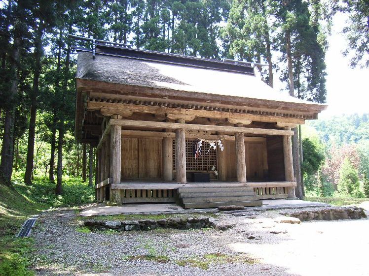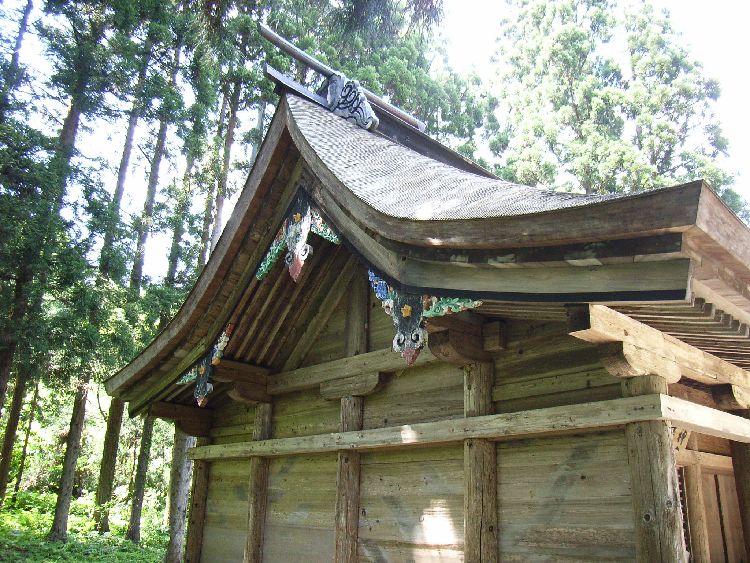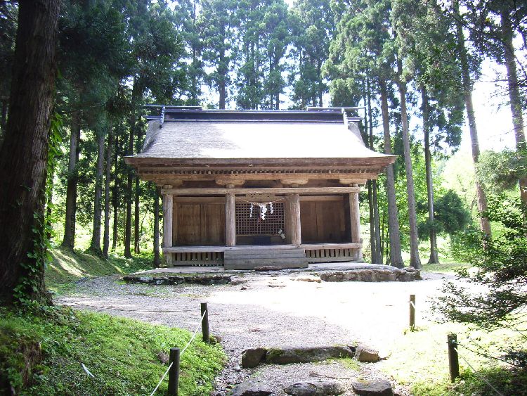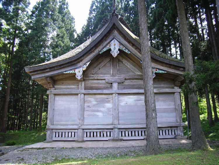 | 波宇志別神社神楽殿概要: 波宇志別神社神楽殿は案内板によると天正12年(1584)の墨書がある大規模の厨子があることなどから室町時代後半の建物と推察されています。太い柱や舟肘木や桁などの形式からも、室町時代の建築の特徴が良く現れていると言えます。母屋の前後に庇を延ばす両流造りは東北唯一で、全国でも6棟しかない貴重な建築物です。内部の厨子には製材年代が1200年前の鎌倉時代のものが使用されており、創建当初の建物の再利用とも言われています。平成2年から4年にかけて解体修理が行われ、建立当時の姿に復原を行い、軒から上方と側面の妻飾りの破風や懸魚は江戸時代初めの寛永14年(1637)修理時の形式となっています。神楽殿前の扇池には、元禄15年に作られた絵図は書かれていなっかったので後に作られたものだと考えられますが、 唐松神社境内にある「唐松山天日宮」も石垣を使用しているものの池の上に塚がある形式を取っているのが興味深い所です。波宇志別神社神楽殿は昭和55年に国指定重要文化財に指定されています。