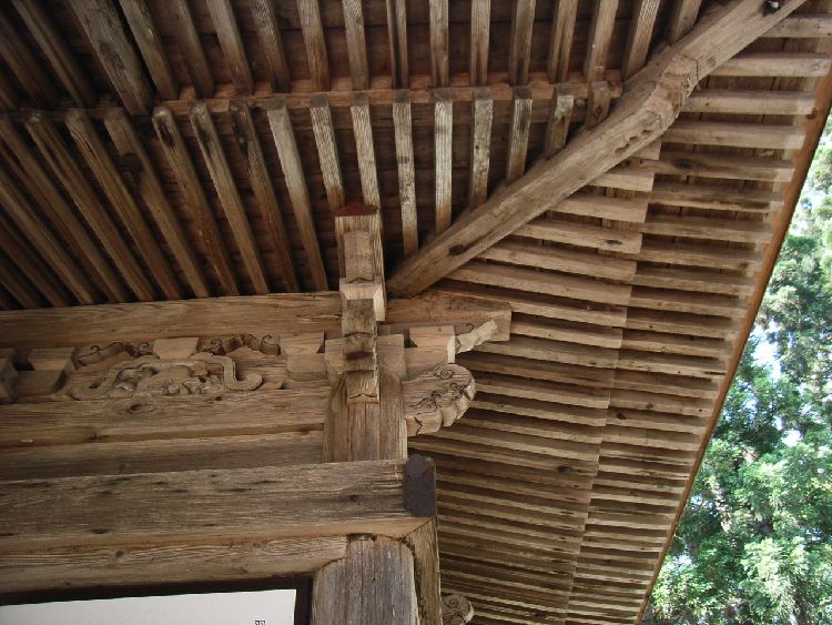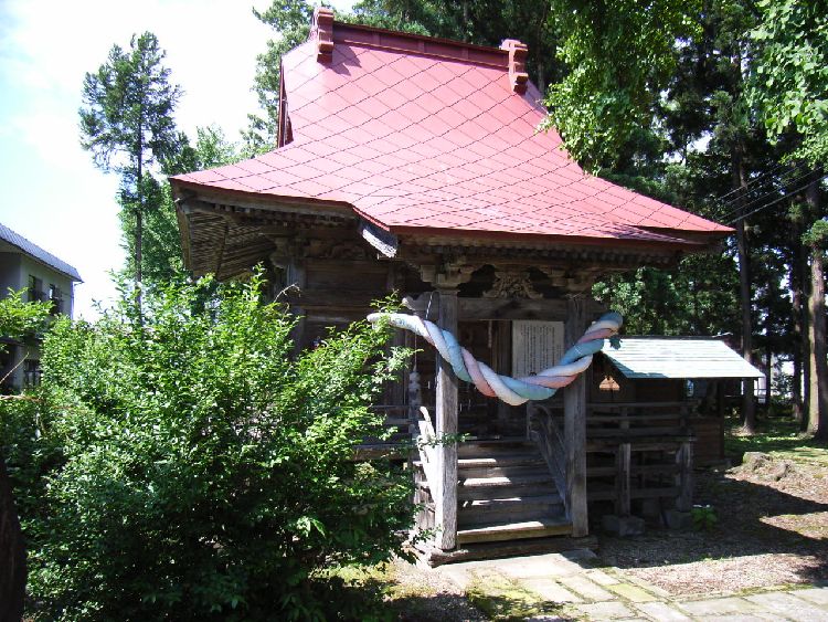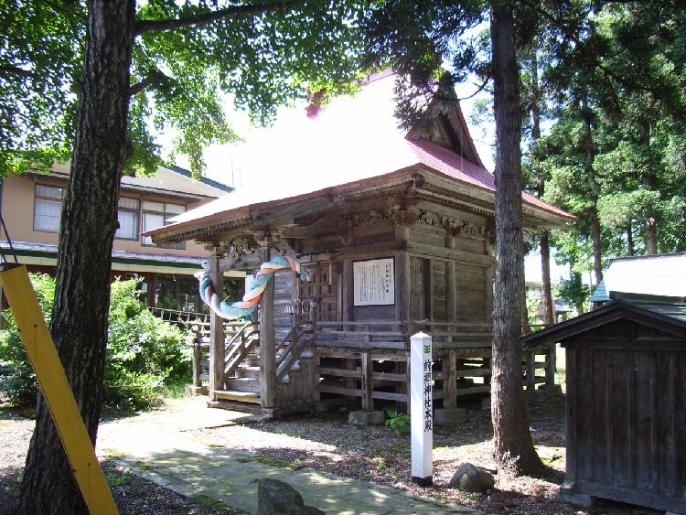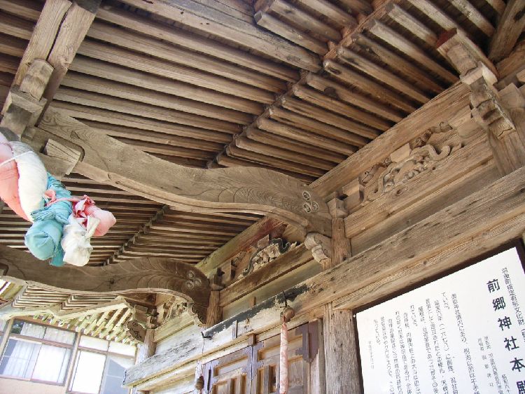 | 前郷神社概要: 前郷神社は西馬音内の社寺建築の歴史上重要な建物です。案内板によると「御嶽神社盛大にあり、明治以前は千手観音堂と呼ばれてた。延宝6年(1678)に創建、現社殿は正徳3年に観音堂として建立されたとの軒札、矢板が現存する。屋根は、当初茅葺であったがその後、鉄板葺に替えられている。向拝柱、内陣円柱上の大斗は皿斗で木鼻は大仏様の崩れの如く肘木は禅宗様であるが、全体といして和洋色が濃い。向拝の蛙股はこの地域の同時代の他の例に類似し、海老虹梁はややグロテスクで、この地域の時代性や特徴をもっている。」としています。前郷神社の本殿は羽後町指定有形文化財となっています。