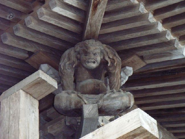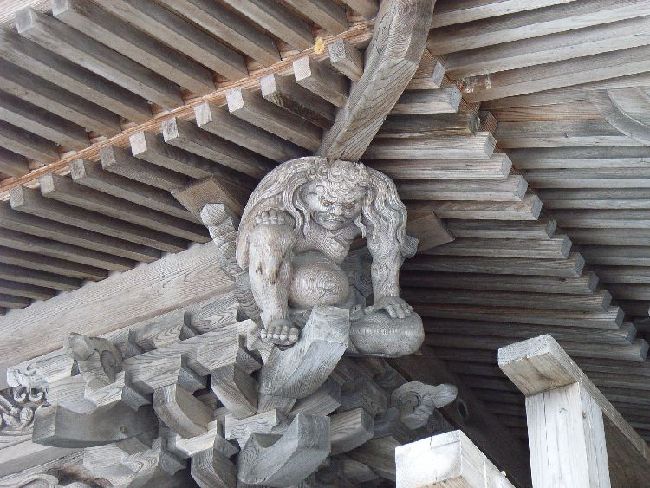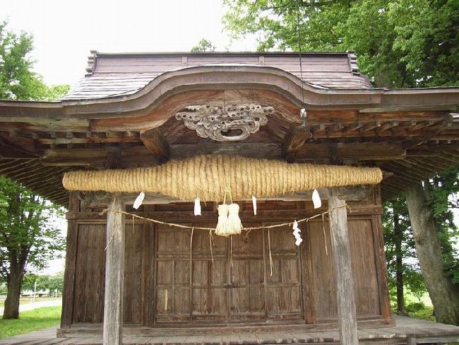 | 八坂神社概要: 八坂神社は沼館近郊にあります。この神社の特徴も上記の沼館八幡神社と同様注連縄です。小ぶりな建物に似つかわしくないほど極太な注連縄は一体どのような意味が込められているのでしょうか?社殿は拝殿が2間、本殿は1間にも満たないほどなのでさほど大きくはありませんが、本殿の建築彫刻は目を見張るものがあります。社殿全体が彫刻化して隙間が無いほどで、このような形態は多分幕末から明治時代のものだと思うのですが、特に文化財指定がないのが不思議な程です。特に見所は4体の力士が屋根を支えているところです。横手市には力士像がある神社が多いのですが、この神社の力士はかなり洗練されたデザインになっています。神社右手にあるのはもしかしたら神楽殿か見世物小屋かも知れません。もしそうだとしたら文化面でも貴重なものと言えます。又、境内には道標が置かれていて当時この神社が道路の結束点として神聖視されていたことも考えられます。