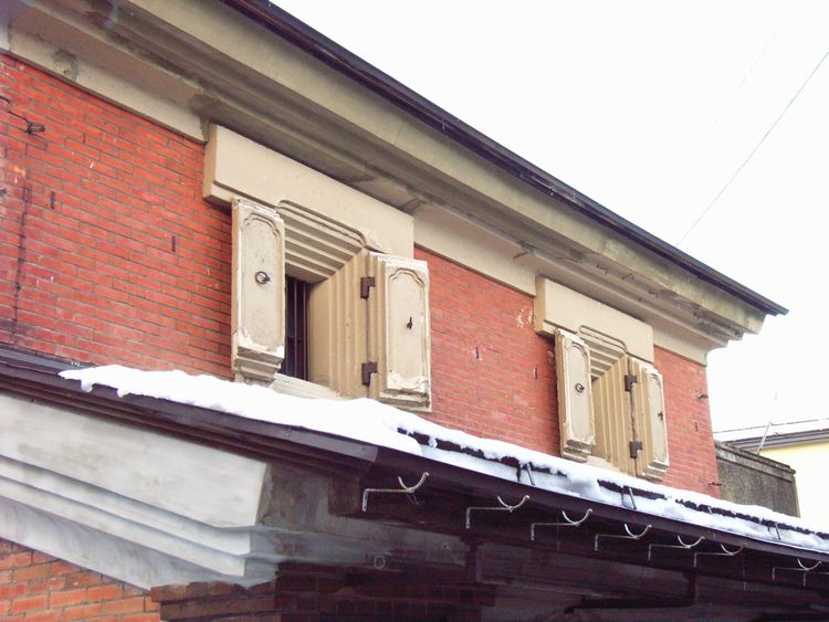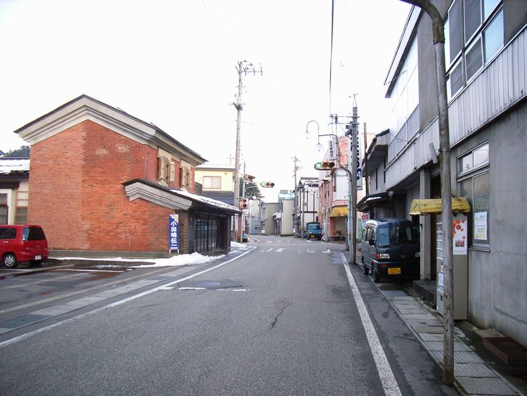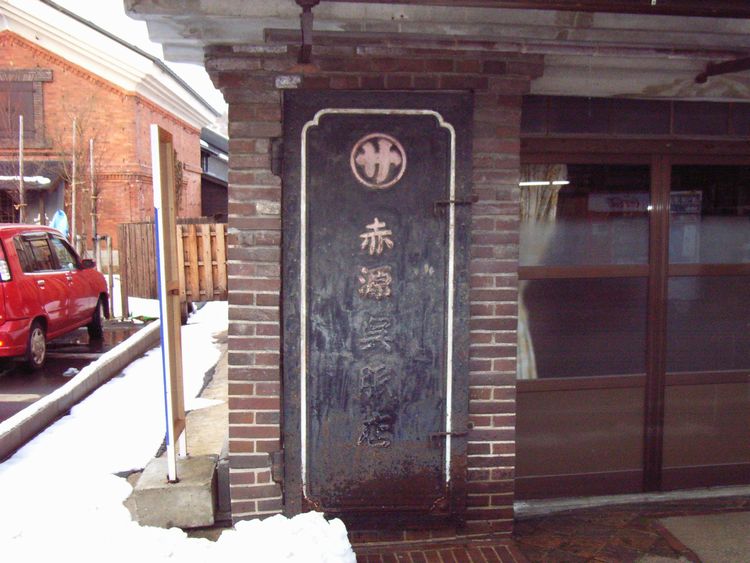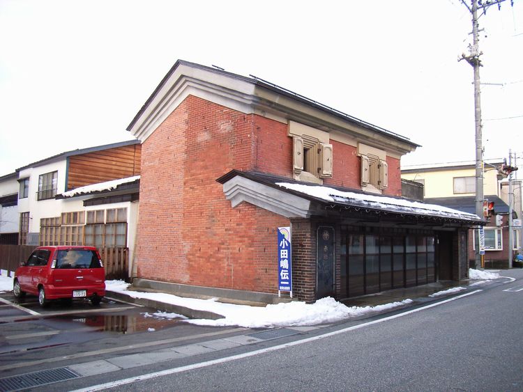 | 赤源呉服店概要: 赤源呉服店は明治32年(1899)に建てられました。煉瓦造りの2階建ての店蔵で切り妻平入りで旧街道沿って建っています。秋田県内で煉瓦造りの町屋建築は少なく大変貴重な建物だと思います。秋田県内に見られる道路と平行の「ウダツ」も目に付きます。当初、秋田県内には妻入りの町屋が多い為違和感がありませんでしたが、平入りの町屋も妻入りの建物と同様のウダツがあるのは驚きです。ある種の秋田スタイルなのかも知れません。(有名なウダツのある他県の町屋では道路に対して垂直で火事の延焼を防ぐ機能を持ち、家の格式が分かる程意匠に凝ったものもあります。※秋田県内でも鹿角地方は南部藩の影響からか道路に対して垂直のウダツです。)赤源呉服店は大森町の町並みにとって重要な要素の1つです。隣接する赤レンガ蔵と同様に保存してほしいものです。