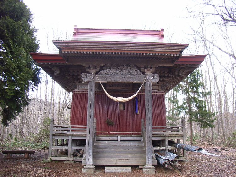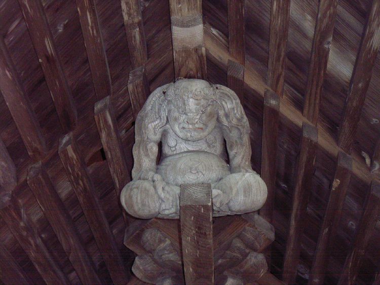 | 塩湯彦鶴ヶ池神社概要: 塩湯彦鶴ヶ池神社は案内板によると「千古の式内社であり清原氏の氏神であった塩湯彦神社の本殿は、ここから北方約10キロメートルの大松川字御嶽山3番地に鎮座している。この塩湯彦鶴ヶ池神社は昭和12(1937)年、御嶽山上の本殿を遥拝するため建立された。」とあります。現在力士像は隅木部分に3体あり、もう1体は何らかの理由で欠落したと思われます。昭和年代に作られたせいか小ぶりで精練された印象を受けました。本社である塩湯彦神社は秋田藩三国社の1つとして藩主である佐竹氏から崇敬されていましたが、ここは遥拝所といこうとで若干規模が小さいように感じます。ただ鶴ヶ池を望める景勝地なので、元々何らかの聖地だったのかも知れません。