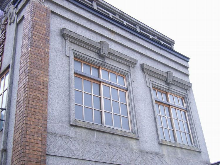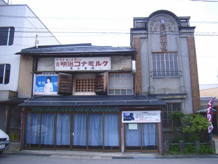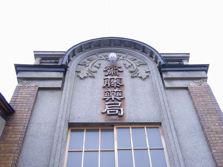 | 斎太薬局概要: 斎太薬局は横手市四日町の旧羽州街道沿いにある薬局店で、店舗は明治30年、調剤室・応接室は昭和初期に建てられました。和風建築と洋風建築との組み合わせは何ともユニークです。店蔵の方は横手市の大火災前の建物として貴重とされ、洋風部分は他の建物より高く造られデザイン的にも凝っているので結果的に洋風部分が強調され独特な雰囲気になっています。正面はモルタルのリレーフ状にデザインされ屋根にはセグメンタルペディメントと呼ばれる半曲線の櫛形破風を取り入れ、屋上をデザインされた手摺を回す事によって印象深くしています。窓のまぐさもモルタルでデザインしより立体的に強調し、建物の正面隅にはタイルを使用する事や窓の形などにより縦長の建物が鮮明になっています。国登録文化財に指定されています。