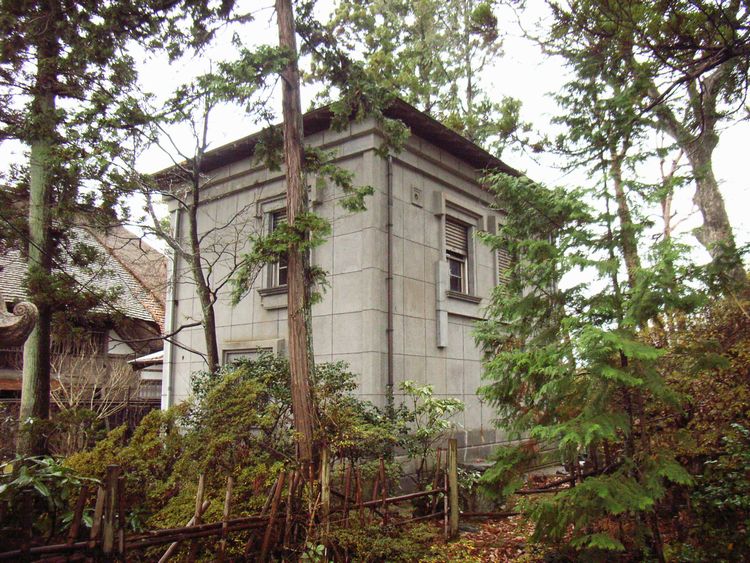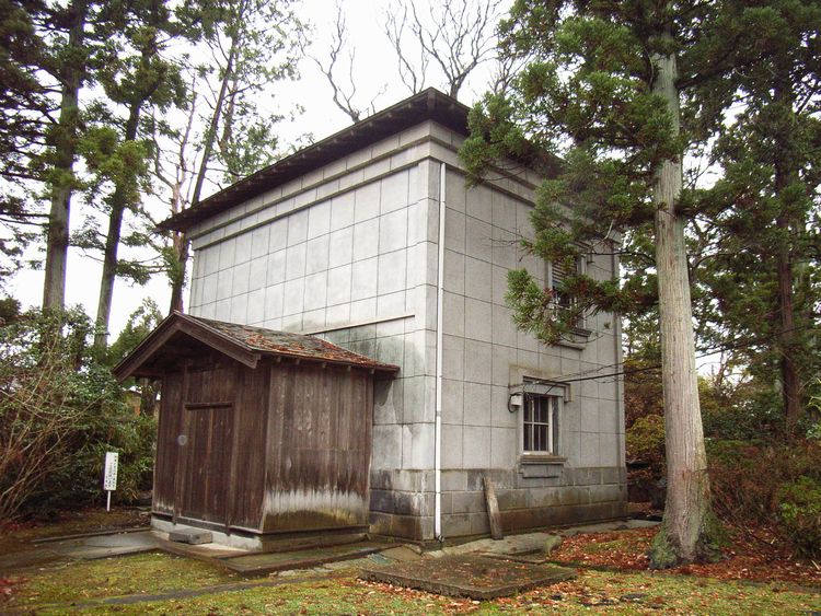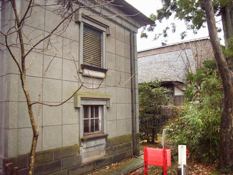 | 旧奈良家住宅文庫蔵概要: 旧奈良家住宅文庫蔵は案内板によると、大正13年(1924)に建築(大工棟梁は安部貞治)されました。木造2階建てで、屋根は寄棟造りの銅板葺きです。外壁は、目地切・擬石塗壁で洋風な雰囲気を出しています。旧奈良家住宅の中では最も新しい建物で、当時は洋館と呼ばれ、内部の床は板張りで家具調度が置かれていたそうです。国登録有形文化財このような建物(文庫蔵と称した洋風建築)は秋田県内の地主の建物に多く一種のブームだったようです。現在でも数棟残っていますが、中でも大仙市にある池田家には私設図書館と称する建物が残っています。