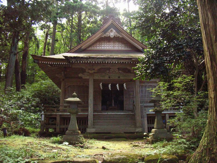 | 真山神社概要: 真山神社の創建は景行天皇年代に武内宿禰が涌出山(現在の本山、真山)に登り、国家安泰と武運長久を祈願したのが最初とされています。神仏習合の神社で男鹿半島の修験の拠点の1つとして発展しました。江戸時代には秋田12社に列せられ佐竹公の庇護を受けました。明治に入り明治の廃仏毀釈によって、赤神神社から真山神社に改名しました。現在でも神社山門(旧光飯寺の山門、江戸時代後期)があり、仁王像が安置されているのはその名残でしょうか?拝殿脇の階段は山頂にある本殿へ続く参道です。階段の石畳が歴史の深さからか、所々滑落していて、神秘性がさらに高くなっているような気がします。200m程歩くと真山神社五社堂が見えてきます。現在の五社堂は元々五つの社があったそうですが火災で焼けた為、1つにまとめたものです。内部の壁には落書きがあり、文化元年(1804)の年号も残っているそうです。社殿には随所に仏教建築の特徴が見られ神仏習合だった名残が見られます。五社堂は男鹿市指定文化財に指定されています。