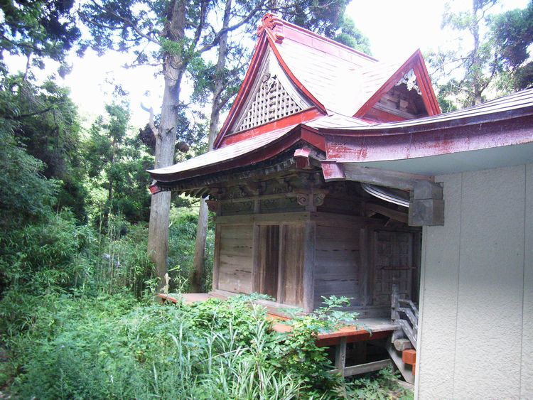 | 戸賀八幡神社概要: 戸賀集落からさらに奥に入る為、なかなか解りづらい所にあります。境内には石灯籠や狛犬、祠などがあり、かなり信仰が深かったようです。拝殿は新しく建てた物で、宗教施設というよりは、集会所的役割を果たしている感じがしました。本殿は寛永4年(1751)に難破船の寄木で造営されたらしく、男鹿市内ではかなり古い建物です。明治32年に屋根や床など改修したそうですが、当時の特徴を良く残しており、男鹿市指定文化財になっています。