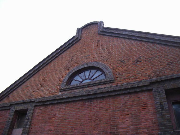 | 小玉醸造概要: 建物の年代はよく解りませんが小玉醸造の創建は明治12年(1879)現在地に味噌・醤油の醸造業として創立し大正2年(1913)には清酒の醸造を開始したとあるので、大正年代に建てられた近代建築と思われます。大きな煉瓦造の蔵ですが、正面の妻面には半円形の窓があり意匠性があります。柱型を外壁に張り出し、壁面と柱、腰壁の煉瓦の色を変えています。屋根と外壁との取り合いも3重に破風を重ね重厚性を出しています。