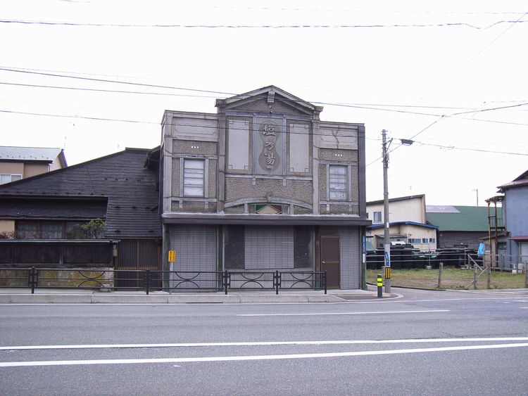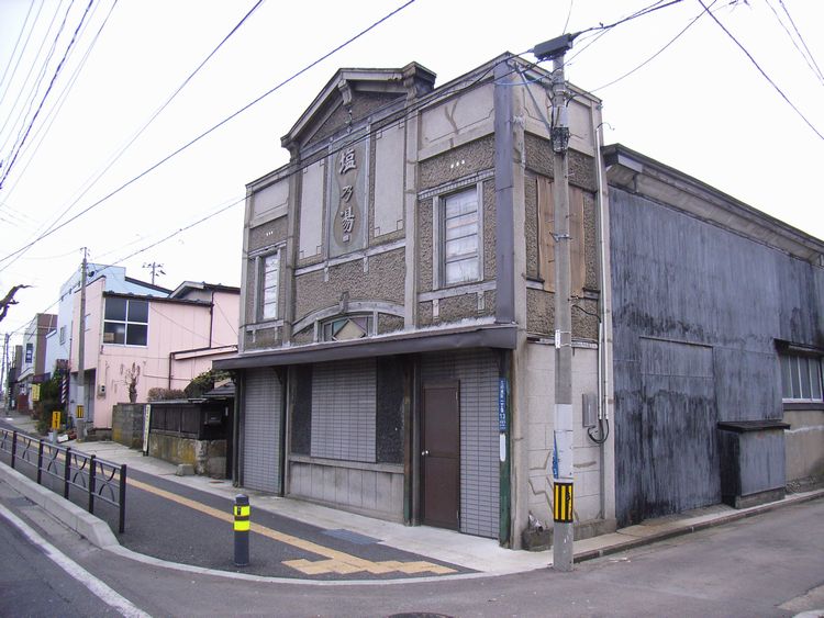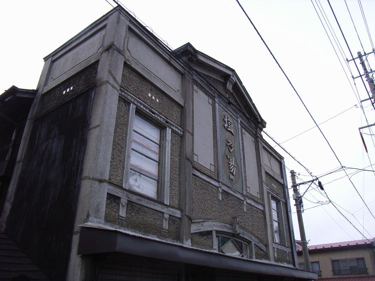| 旧塩乃湯概要: 年代等は良く分かりませんが土崎にある数少ない看板建築の1つです。ファサードが精巧なモルタルによる左官仕上げでかなり凝った印象を受けます。現在は銭湯としては利用されておらず、やがて取り壊されてしまう可能性が非常に高い建物です。当時はさほど珍しくなった看板建築も秋田市内を見渡しても数えるほどしか残っていません。まだまだ昭和前期の近代建築の価値が評価されず保存対象にもなっていないと思われ、どんどん時代を語る建物が少なくなっていまうのは残念でなりません。