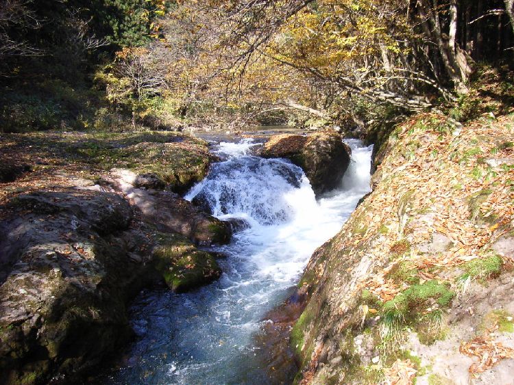 舟作概要: 舟作は岩見峡の見所の1つで、伏伸の滝から600m程上流にあります。高さは2mもありませんが、急流によって岩盤が削られ、甌穴も見られます。溝の形が船の形をしている事からこの名称が付いたといわれ、周囲の風景と一体となり印象深い景観となっています。