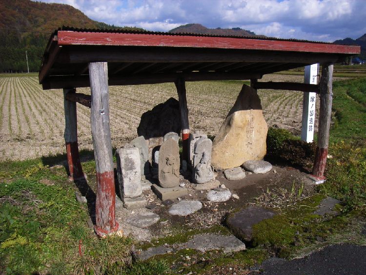 | 鵜養集落概要: 鵜養集落は岩見川系の最奥地にある集落です。十数年前は秋田県内有数の茅葺屋根の多い集落でしたが、現在では数棟を残し、鉄板や瓦葺になってしまいました。茅葺屋根は文化財の指定が無ければ維持管理が不可能に近い状況を考えればいた仕方ないのかも知れません。集落入口には庚申塔や青面金剛を始め様々な石碑、石仏が安置され外部からの悪霊や疫病などの進入を阻止し、集落背後には、坂上田村麻呂や修験僧などの関係が深いとされる岩見神社が鎮座しています。