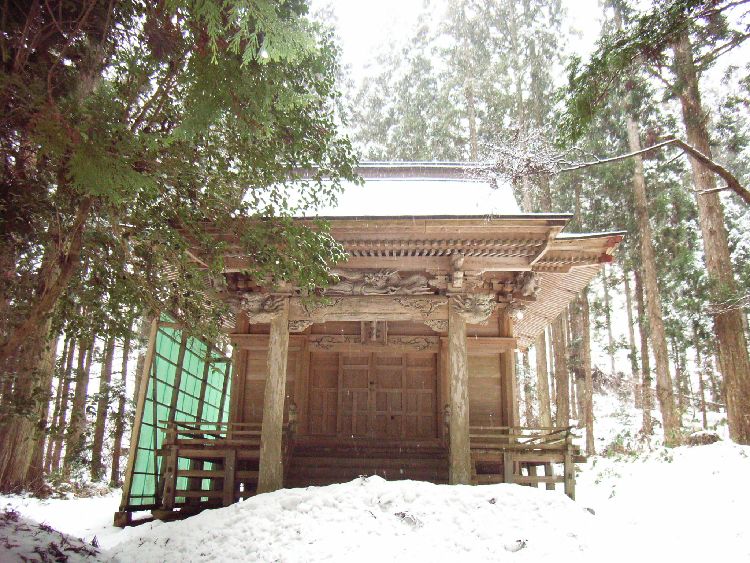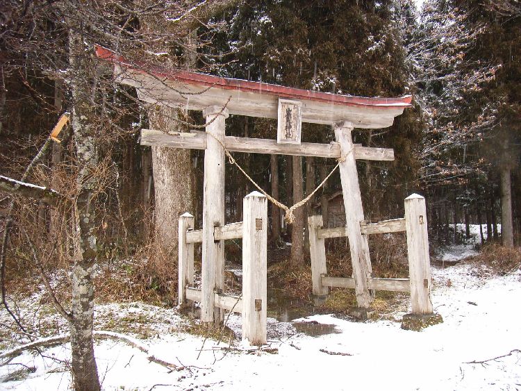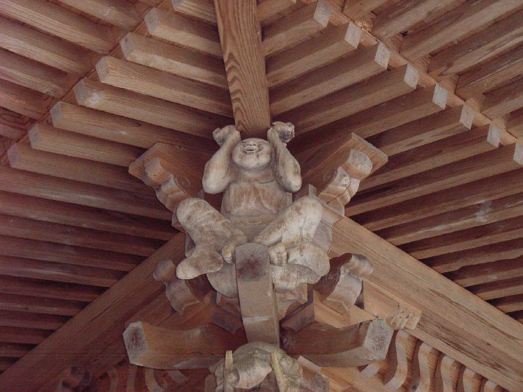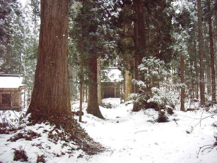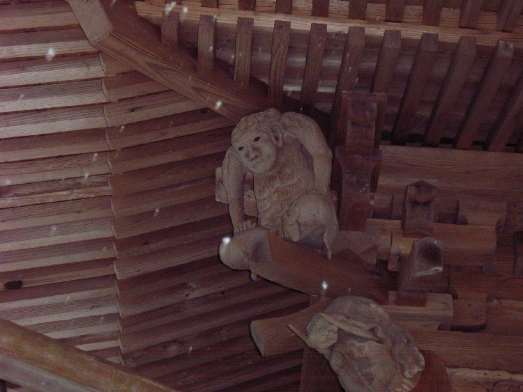 | 岩見神社概要: 岩見神社の創建は分かりませんでしたが、大同2年(807)に坂上田村麻呂が東夷東征の際、大獄丸を討つにあたって岩見神社で戦勝祈願をして、見事討ち滅ぼすことが出来たと言われています。平安時代には千手院などと共に山岳信仰の一角をなし、本尊を薬師瑠璃光如来とし薬師堂と呼ばれていました。現在の境内は新しい道路が参道を横切っている為、多少雰囲気は損なっていますが、石畳や階段、大きく育った杉が並木を造り、かなり古くからある神社の雰囲気が感じられます。参道には「太平山碑」、「保呂羽山」などの石碑が並び多くの信仰を集めたようです。社殿は比較的新しいようですが、拝殿の4隅に力士像が鎮座し屋根を支えています。他の力士像に比べて表情が豊かでとても楽しめる建物です。