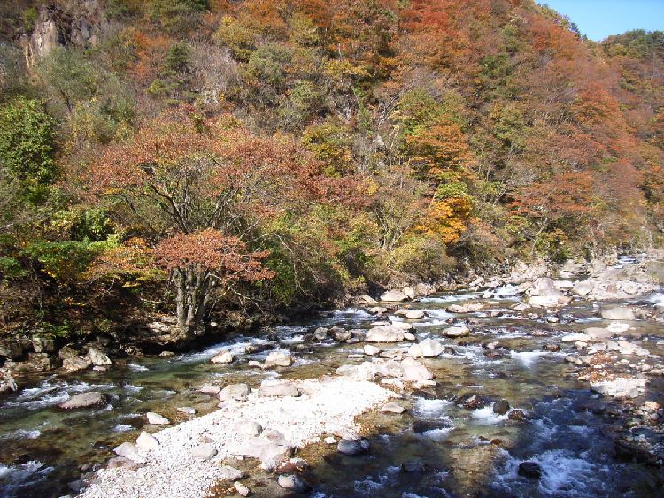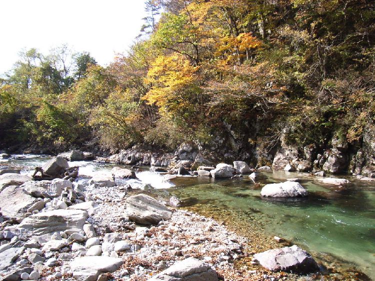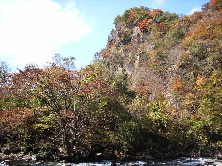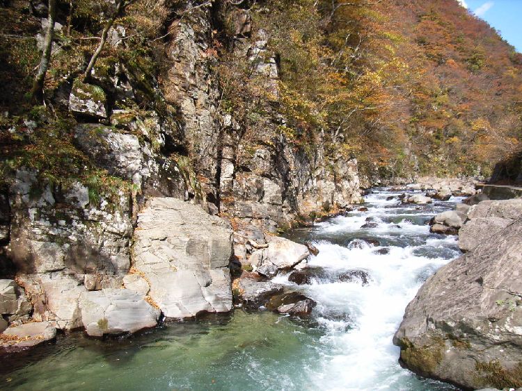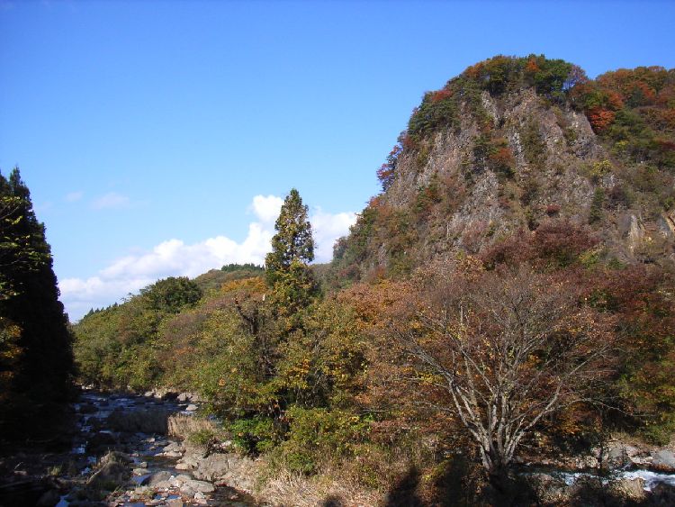 | 岨谷峡概要: 岨谷峡は岩見川上流に位置し、古来からの景勝地となっていました。江戸時代の紀行家、菅江真澄も文化8年(1811)に岨谷峡に訪れスッケチを残しています。両側が岩壁が聳え300mほど続き、特に紅葉の時期は絶景と言われて、秋田三十景にも選定されています。さらに奥地には岩見峡が控え、この周辺が秋田県のヘソにあたる事から「辺岨(へそ)公園」が整備され鵜養集落にある岩見神社境内には辺岨神社か建立されています。