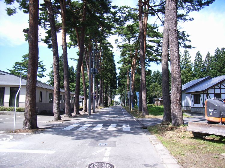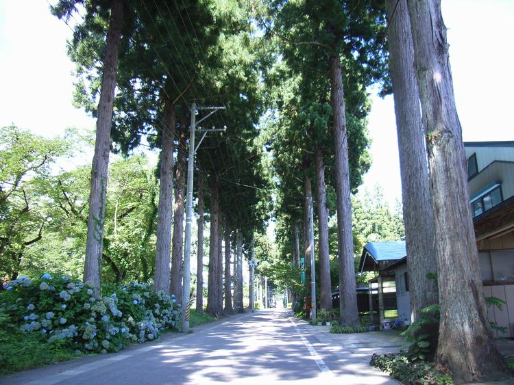 | 松・杉並木概要: 坂本邸の坂本東嶽(理一郎)氏は29歳の時に秋田県議会議員、明治27年には衆議院議員に選出されるほどの優れた人材だったようです。その彼が郷土を憂いこの千屋の地区計画した一部が松・杉並です。町中心地に公共建築を集中させ、放射状に道路(5〜6mで現在でも車が通れるほど、当時地方の集落の道では異例の幅)配し両側に街路樹として松、杉を植樹しました。ヨーロッパで考えられた田園都市思想に基づくもので「村づくり発祥の地」とされています。周辺は「千屋並木緑地環境保全地域」に指定され保全に力を注いでいます。又、「新日本街路樹百景」にも選ばれ、日本を代表する街路樹となっています。